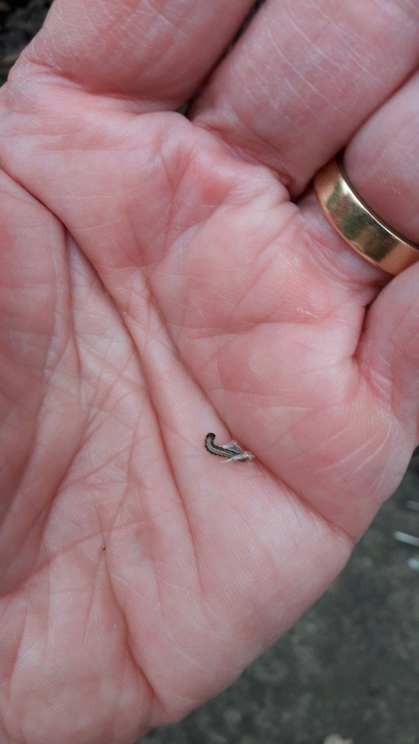 Box tree moth tiny caterpillar pulled out from house web