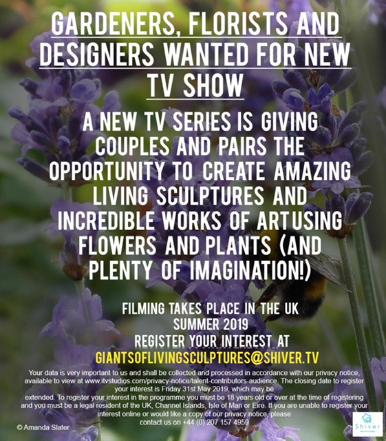 Shiver TV makers of ‘Come Dine With Me‘ and ‘Paul O’Grady: For The Love of Dogs‘ are offering ‘an exciting competition‘ for a couple / pair to design and build giant plant sculptures (often known as as Mosaiculture) in a competition that will be set across the UK and Eire. They are looking for pairs who have a real creative flare and an eye for design, and who compliment each other to marry water culture and art together.