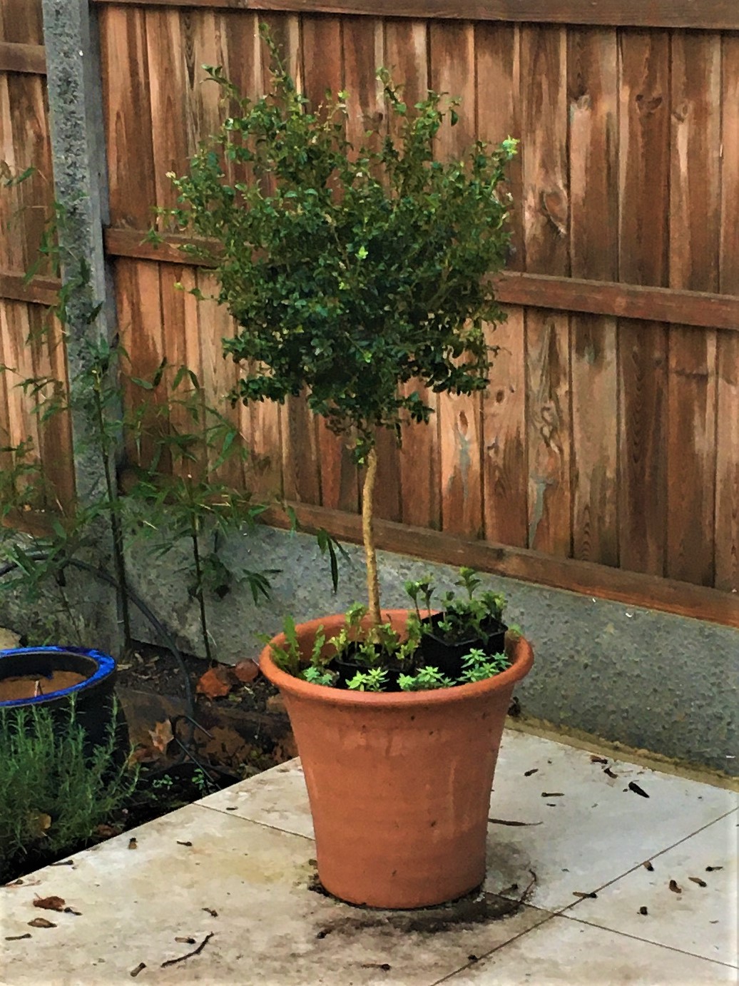 In my small London garden I have two lollipop-shaped topiarised box plants in pots—each pot standing about 40cm tall and the plant another 60cm or so.